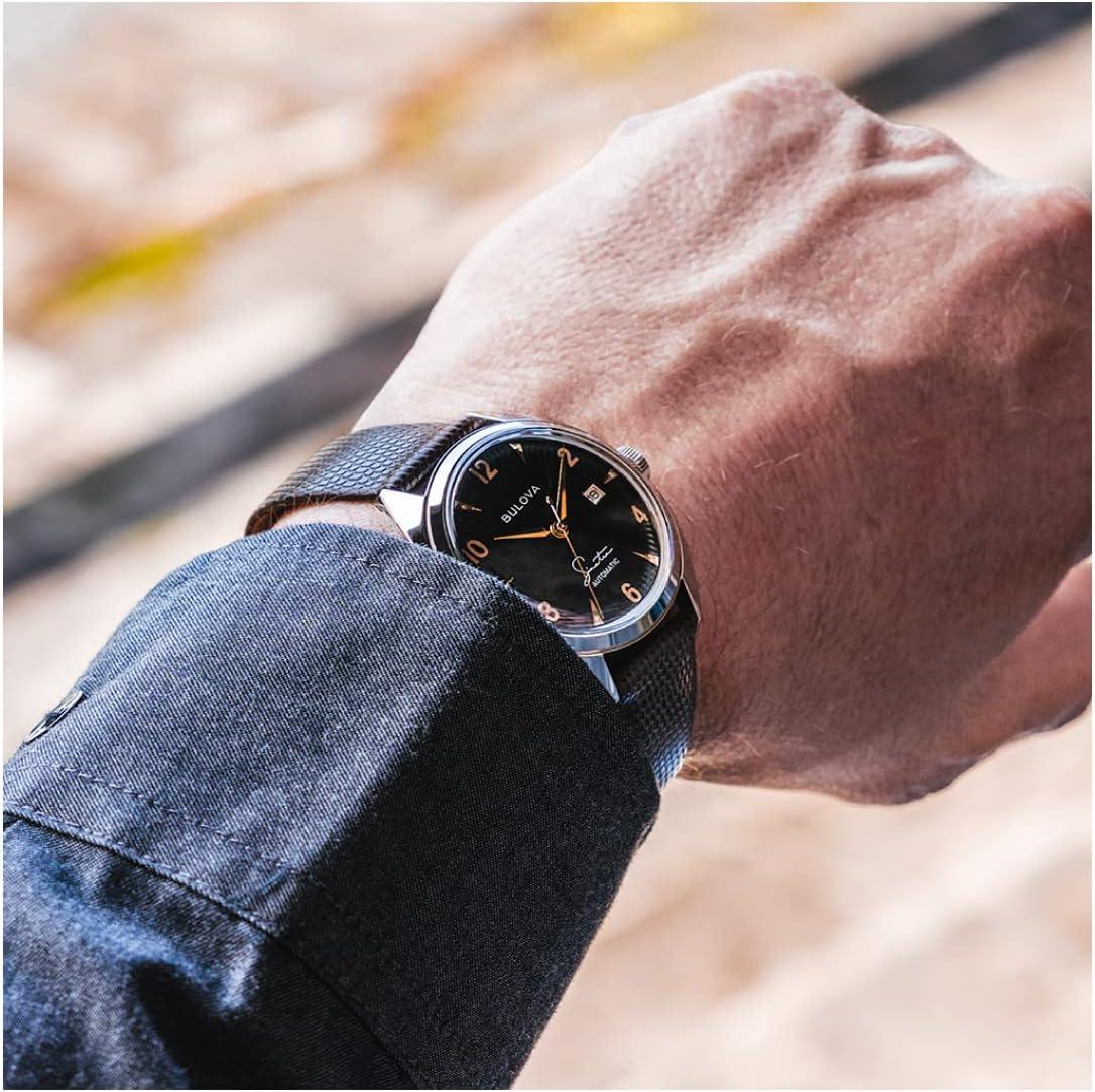 Bulova Men’s Classic 3-Hand Automatic Leather Strap Watch, 21-Jewels, Hack Feature, Luminous Hands and Markers,Open Aperture and Exhibition Case Back(Black Strap/Black Ion-Plated)