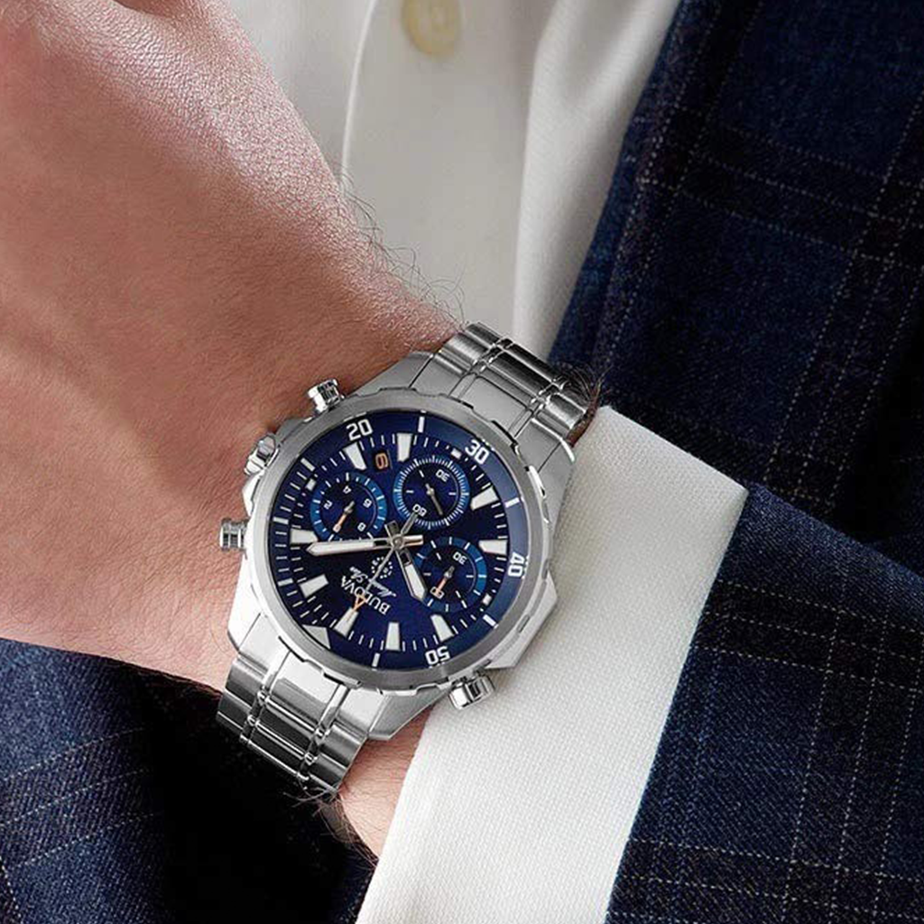 Bulova Men’s Marine Star Series B Stainless Steel 6-Hand Chronograph Quartz Watch, 100M(Blue Strap/ Stainless)